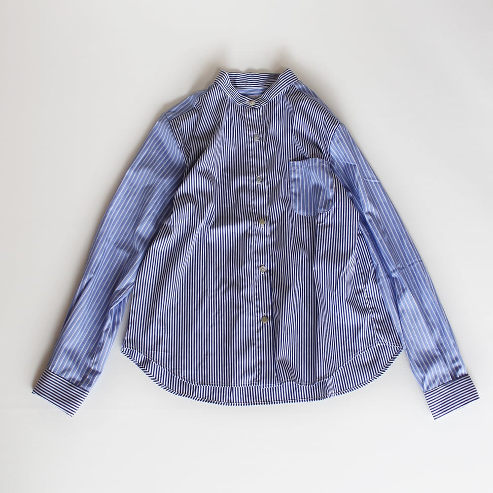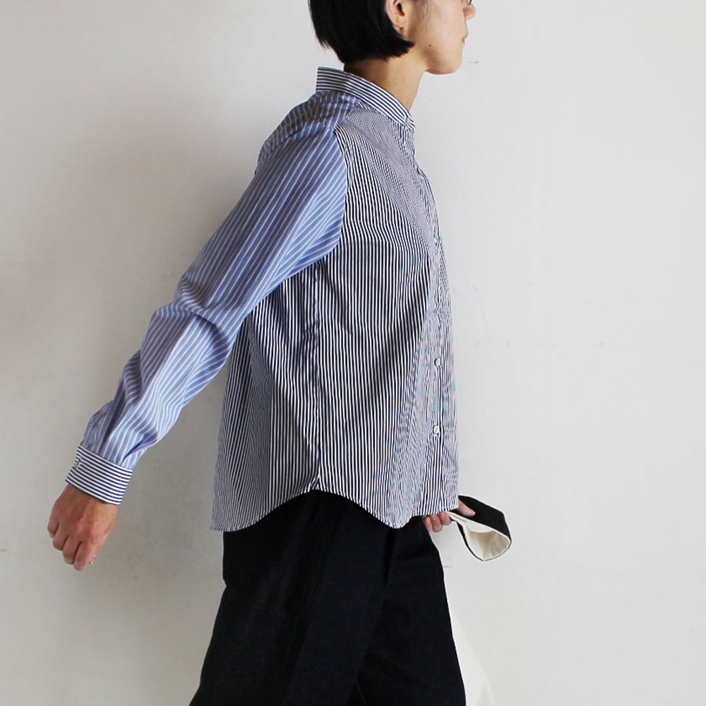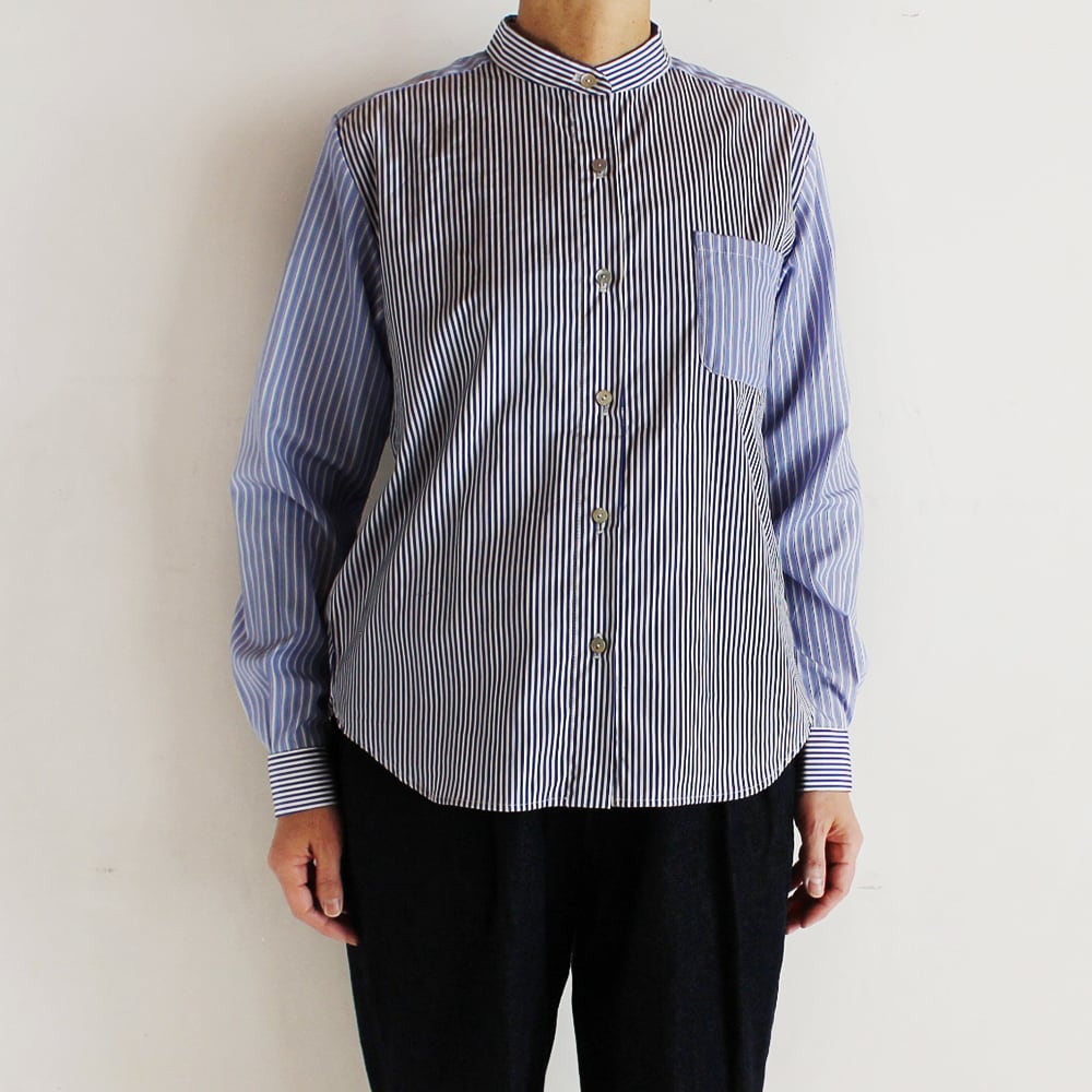 2種類のブルーのストライプの生地を組み合わせた、コットンのスタンドカラーのブラウスです。シンプルなデザインですが、幅の違うストライプ生地を組み合わせたことにより、アクセントになります。ボトムを選ばないスタンダードなデザインです。