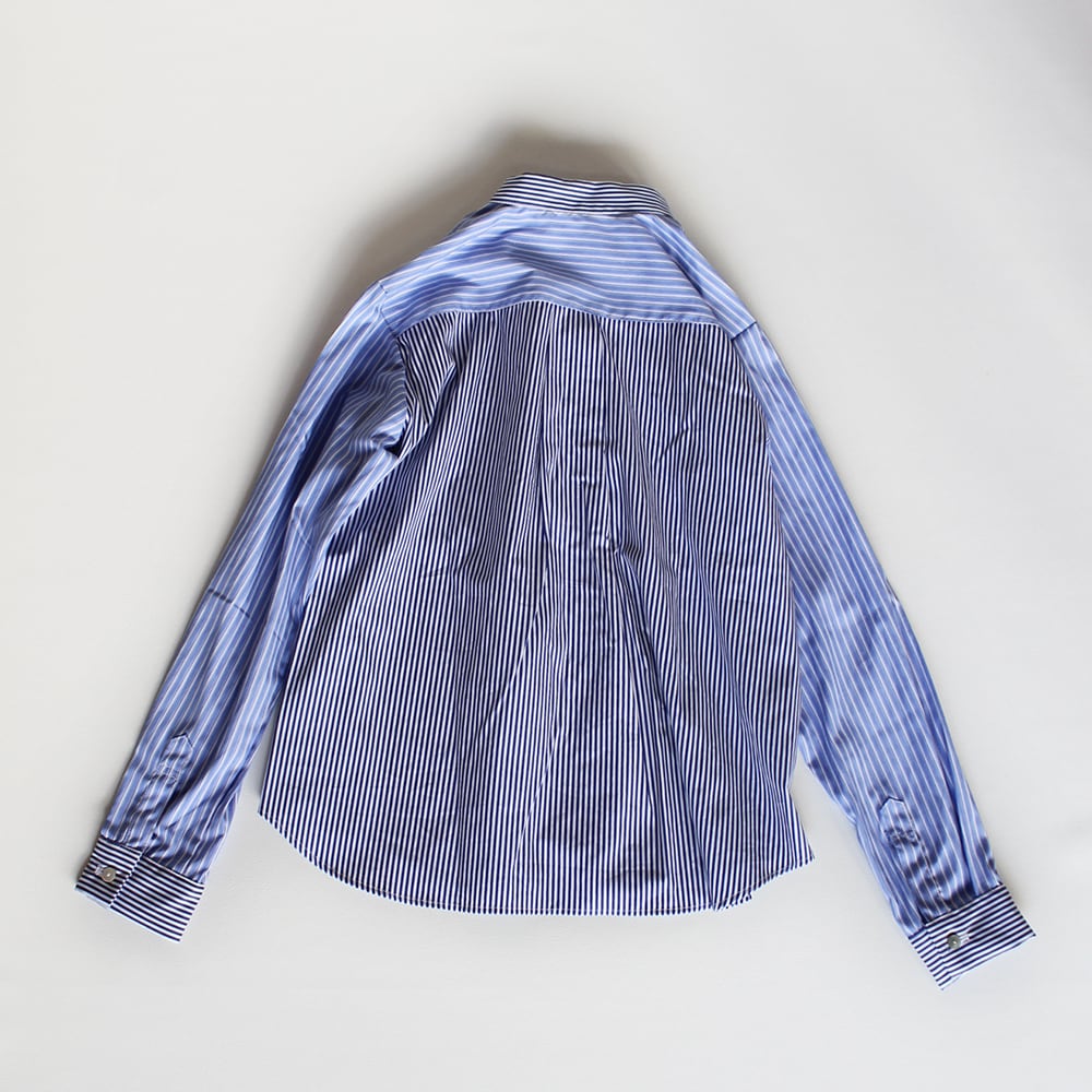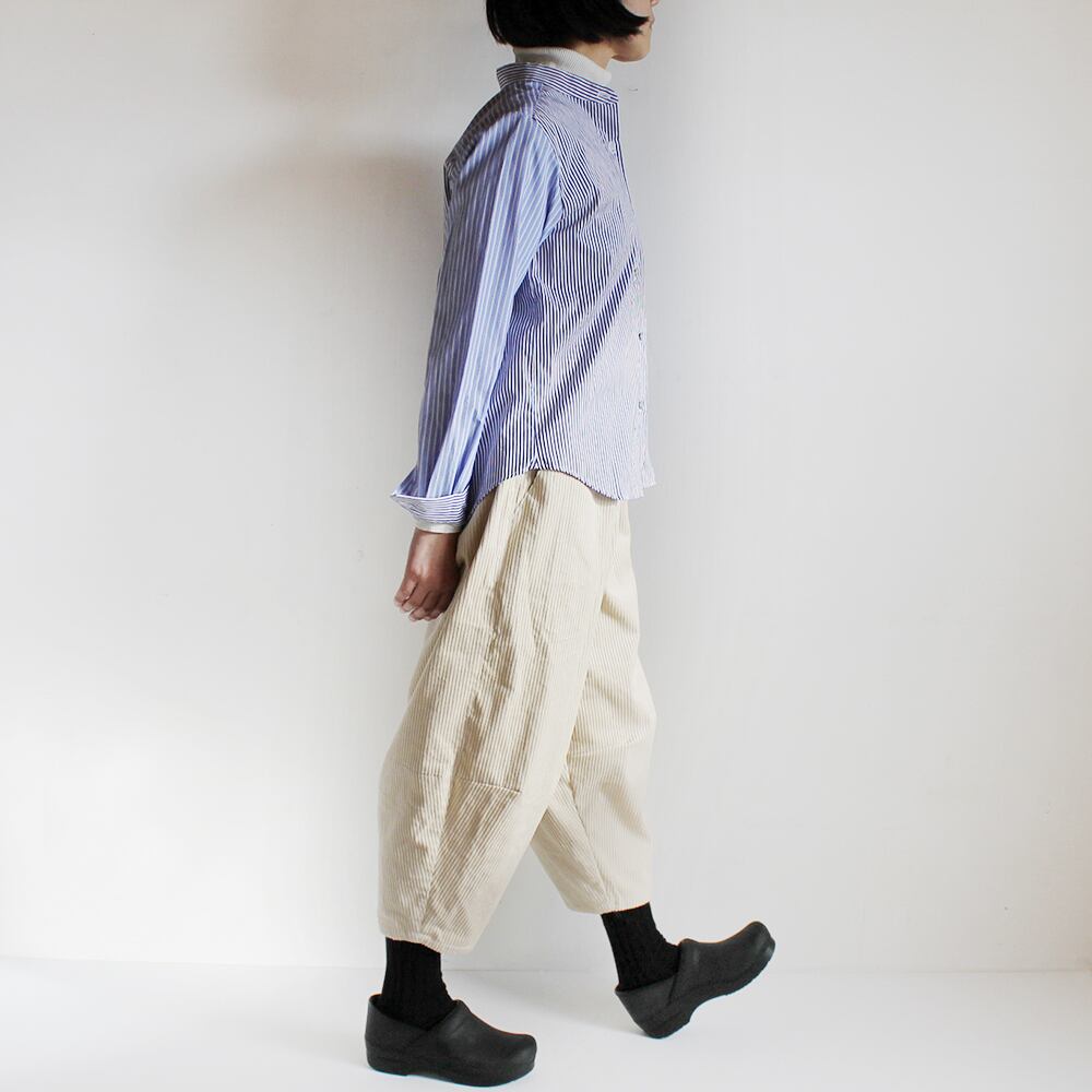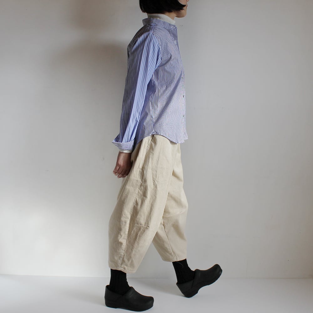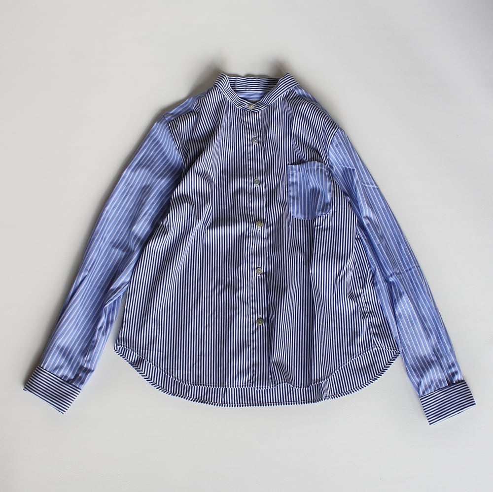 2種類のブルーのストライプの生地を組み合わせた、コットンのスタンドカラーのブラウスです。シンプルなデザインですが、幅の違うストライプ生地を組み合わせたことにより、アクセントになります。ボトムを選ばないスタンダードなデザインです。