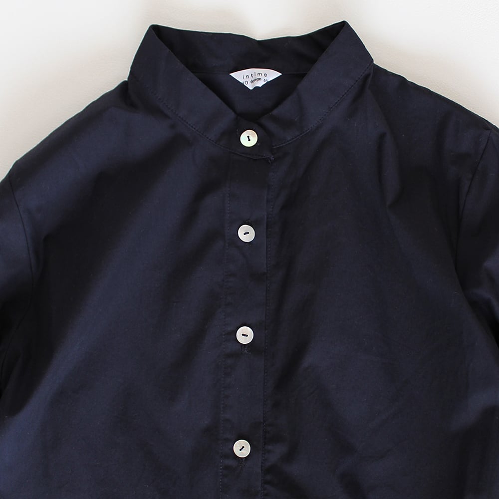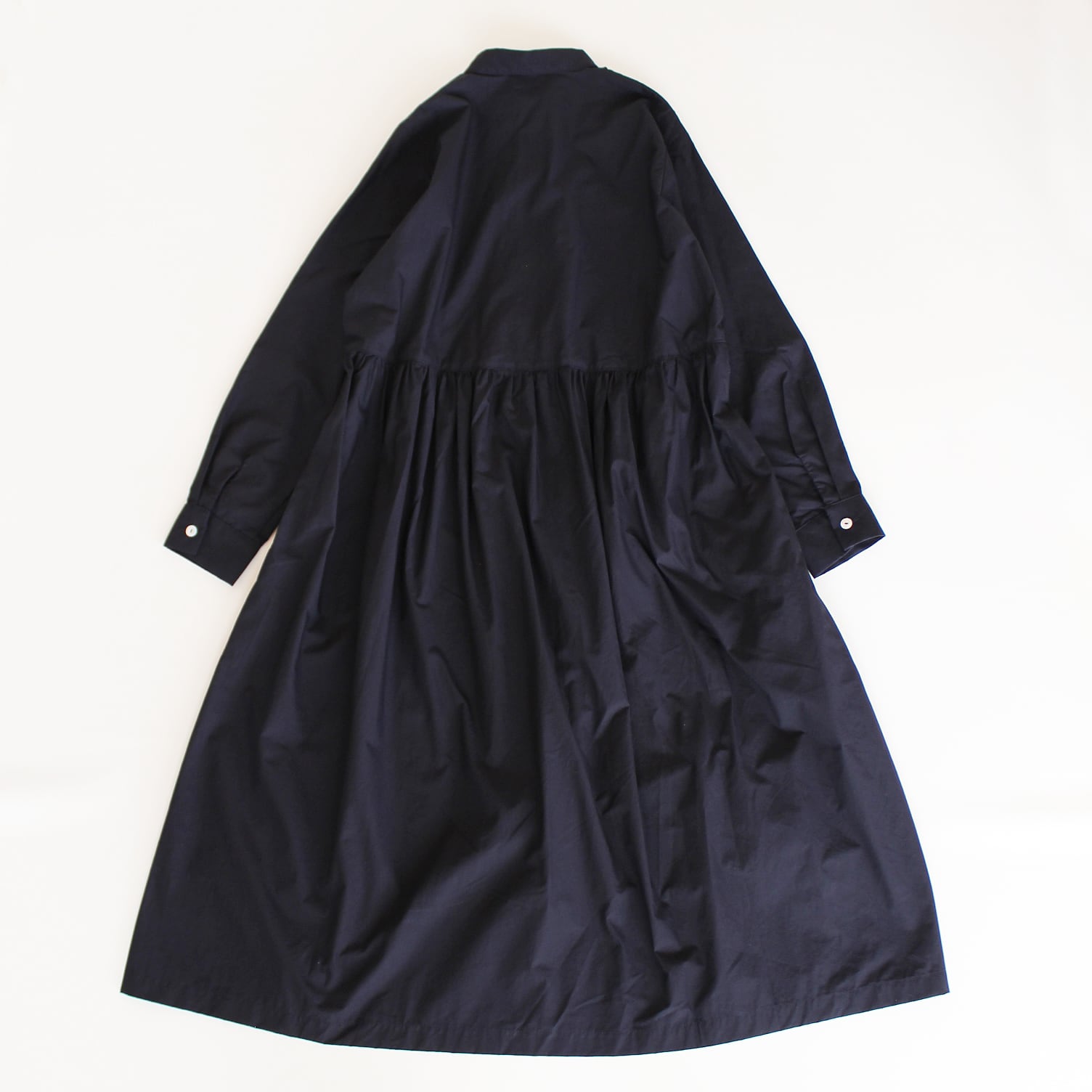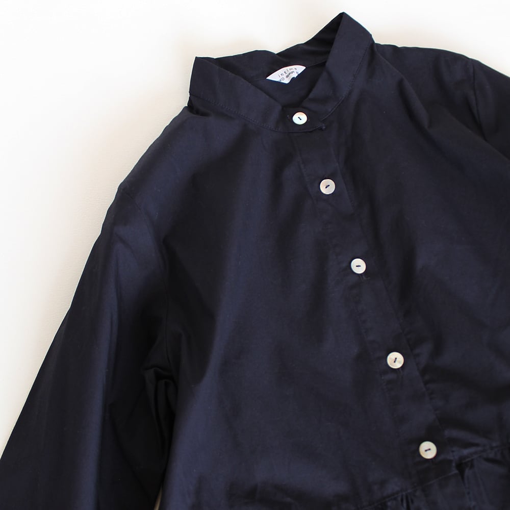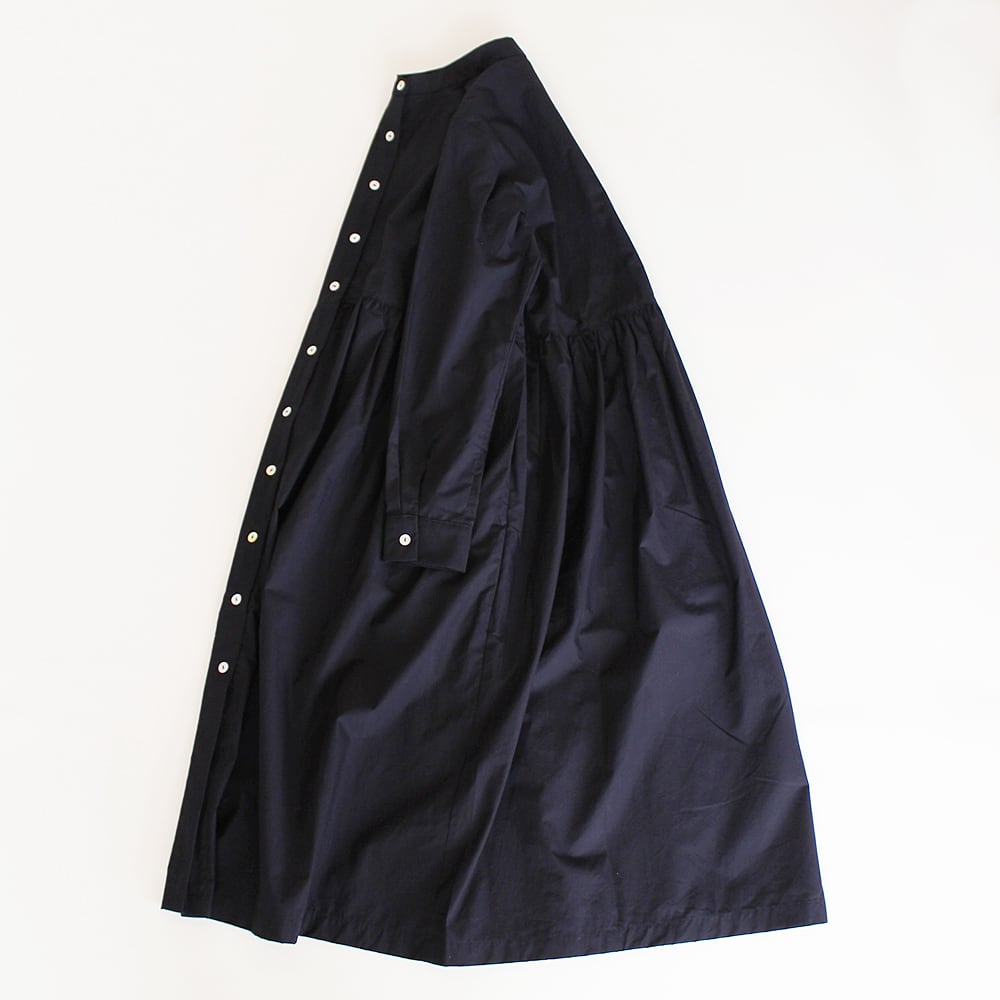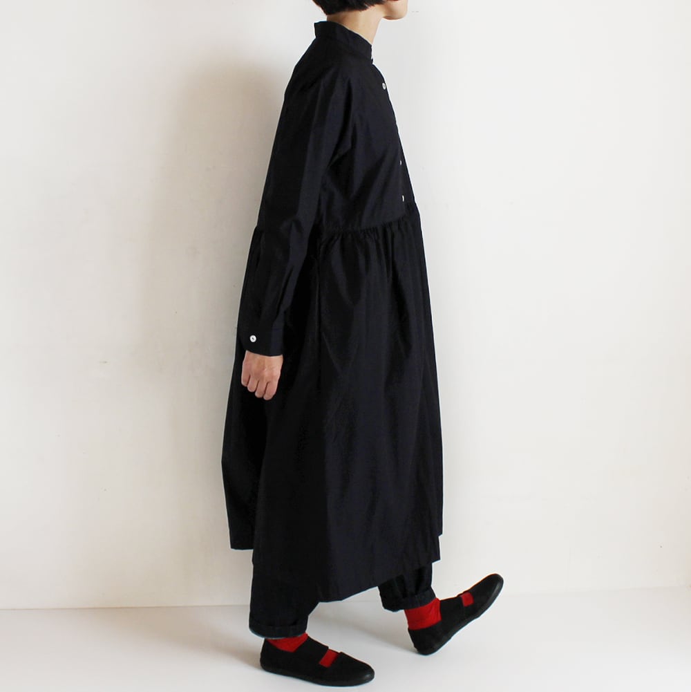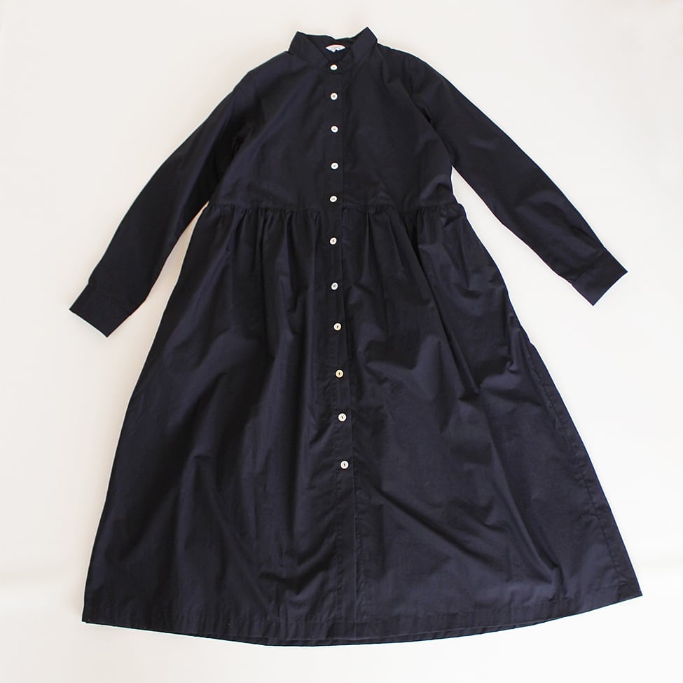 コットンのタイプライターのスタンドカラーワンピースです。ウエスト部分で切り替え、たっぷりとギャザーを入れました。ボタンを閉めるとワンピース、開けると軽い羽織りになります。