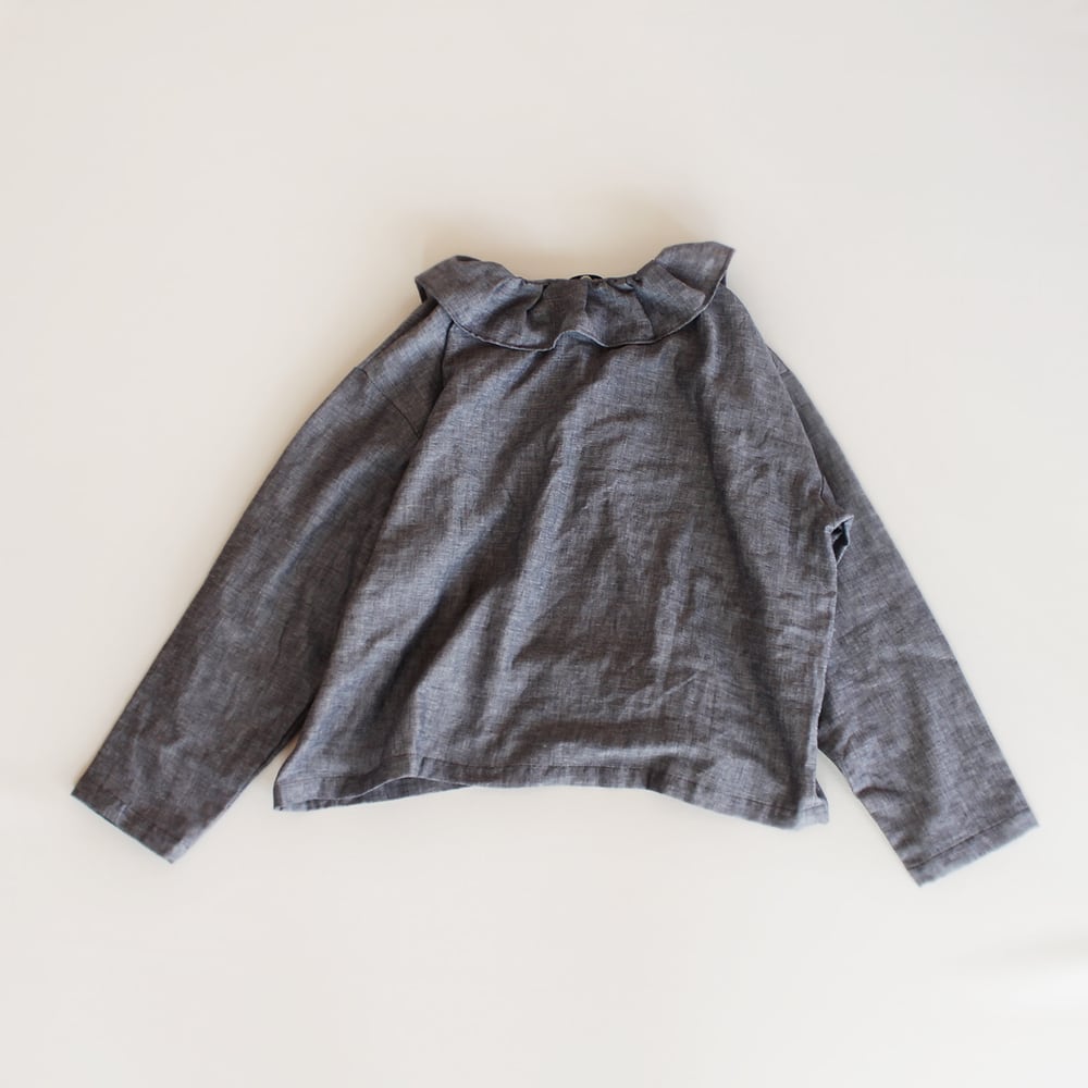 肌触りの良いダブルガーゼで仕立てたフリルカラーのプルオーバーです。ガーゼは洗いざらしで着ることができるのが嬉しいところです。首の部分に緩めにゴムを入れ、脱ぎ着しやすい仕様にしました。パンツにもスカートにも合わせやすい丈となっております。