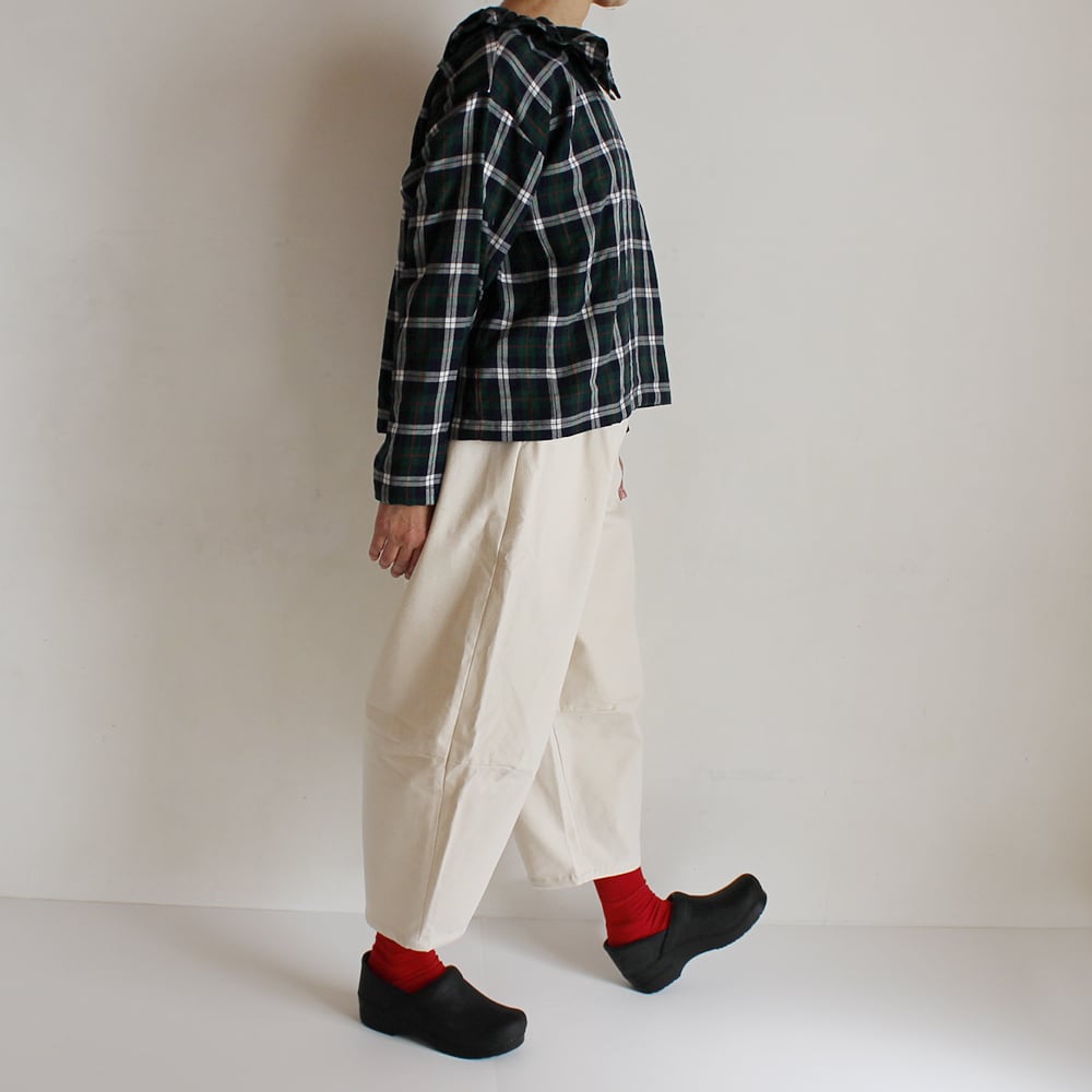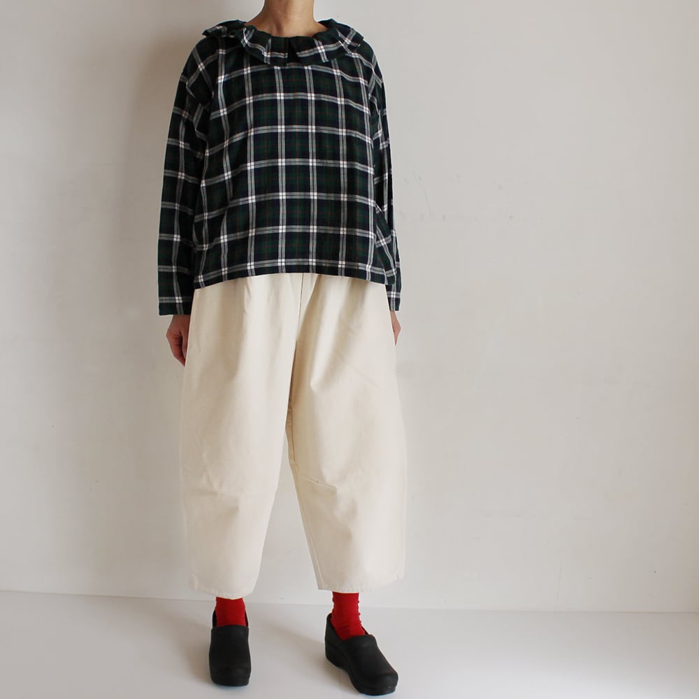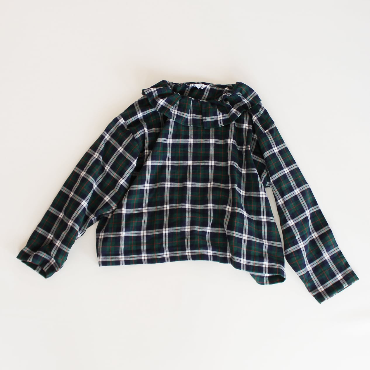 肌触りの良いダブルガーゼで仕立てたフリルカラーのプルオーバーです。ガーゼは洗いざらしで着ることができるのが嬉しいところです。首の部分に緩めにゴムを入れ、脱ぎ着しやすい仕様にしました。パンツにもスカートにも合わせやすい丈となっております。