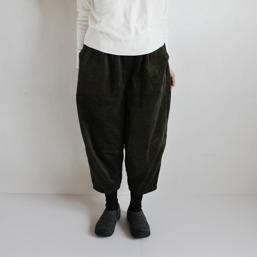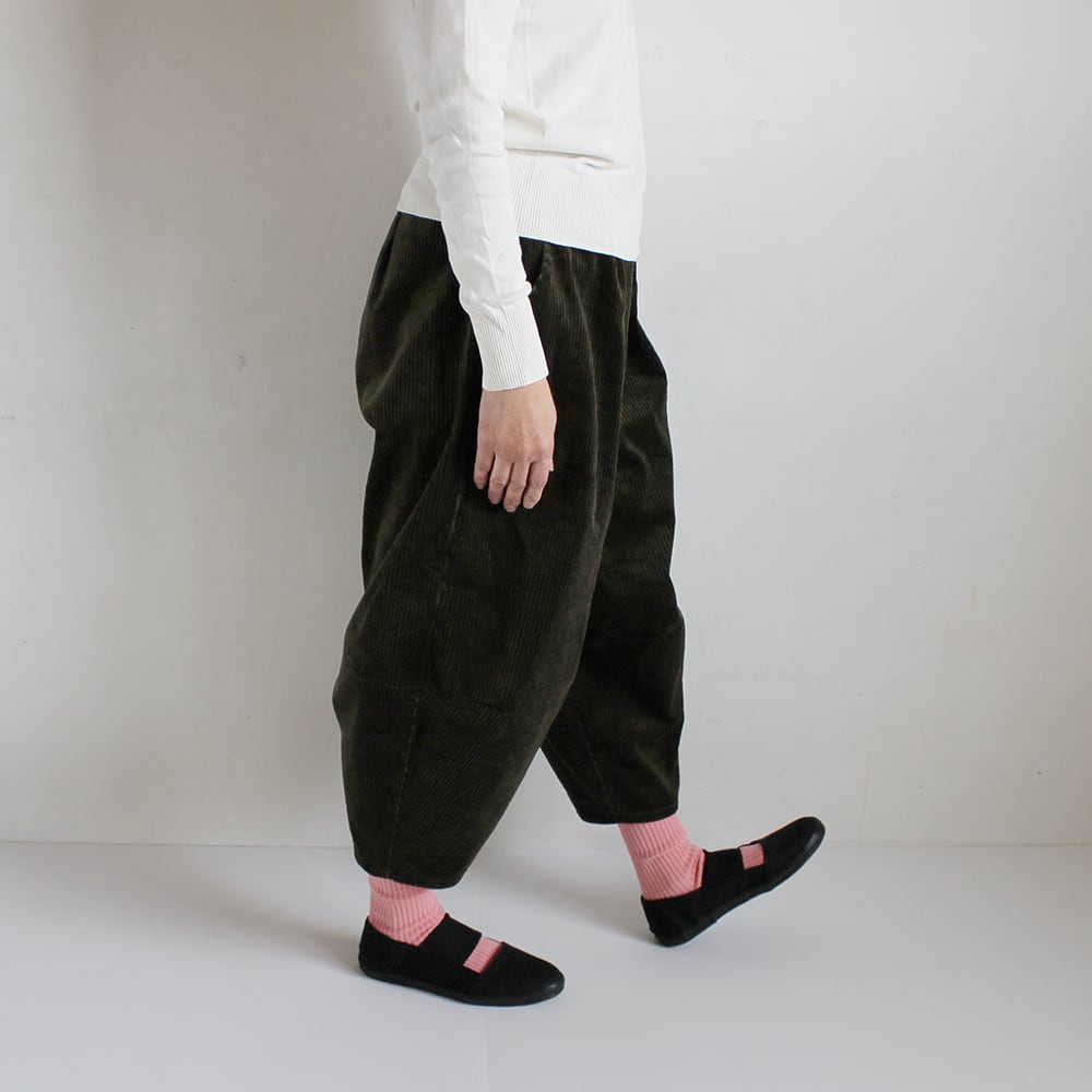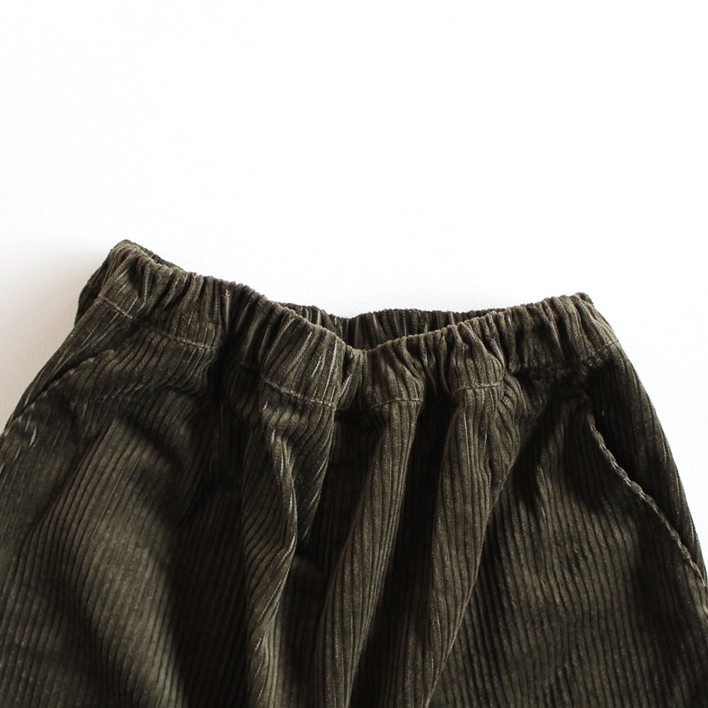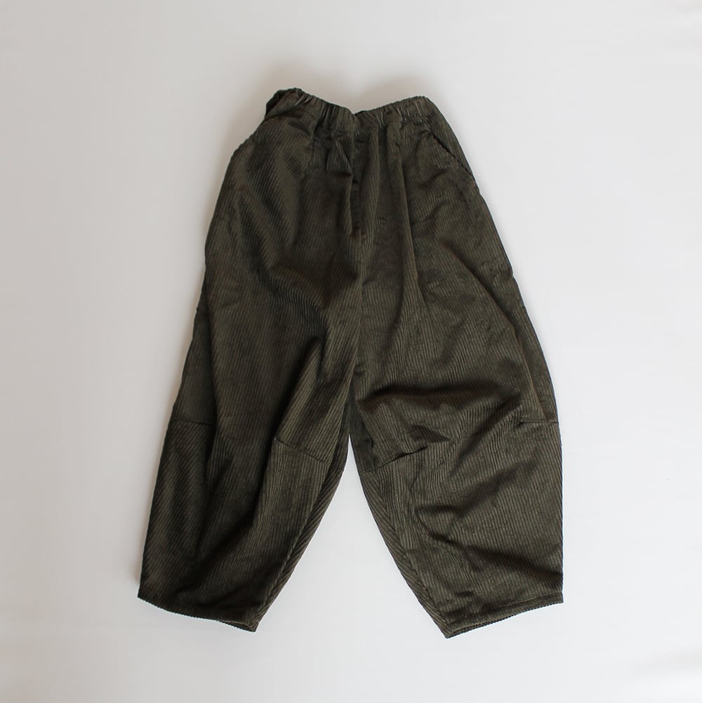 あたたかなコーデュロイで仕立てたバレルパンツです。裾に向かって少しすぼまっているので、足さばきがよく、もたつきません。股上は深めでゆったりとしています。ウエストはゴム仕様でリラックスした履き心地です。ゴムの入れ替え口がありますので、お客様の方で調整していただけます。