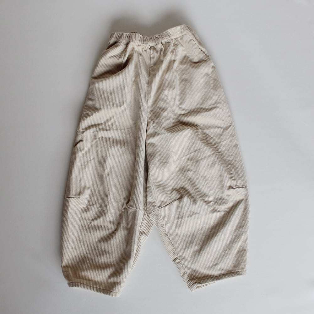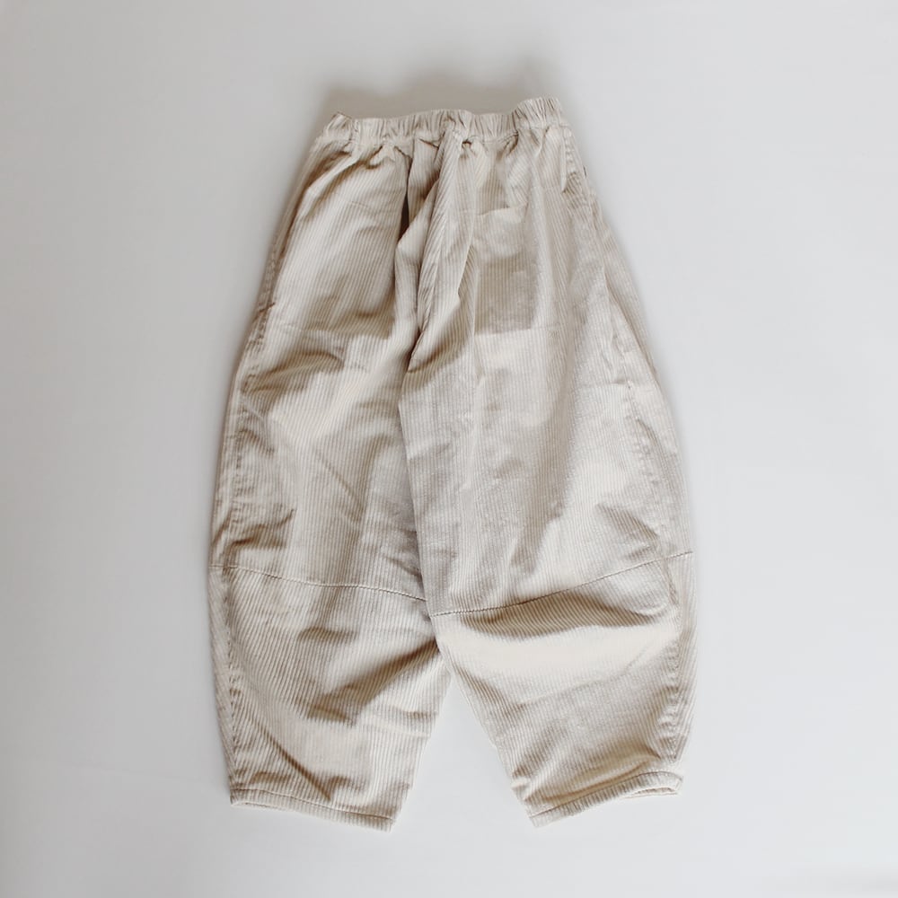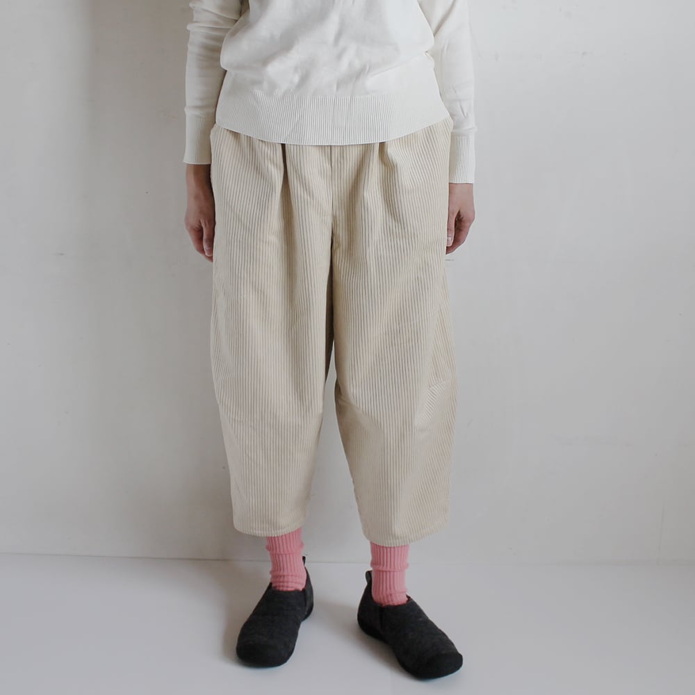 あたたかなコーデュロイで仕立てたバレルパンツです。裾に向かって少しすぼまっているので、足さばきがよく、もたつきません。股上は深めでゆったりとしています。ウエストはゴム仕様でリラックスした履き心地です。ゴムの入れ替え口がありますので、お客様の方で調整していただけます。