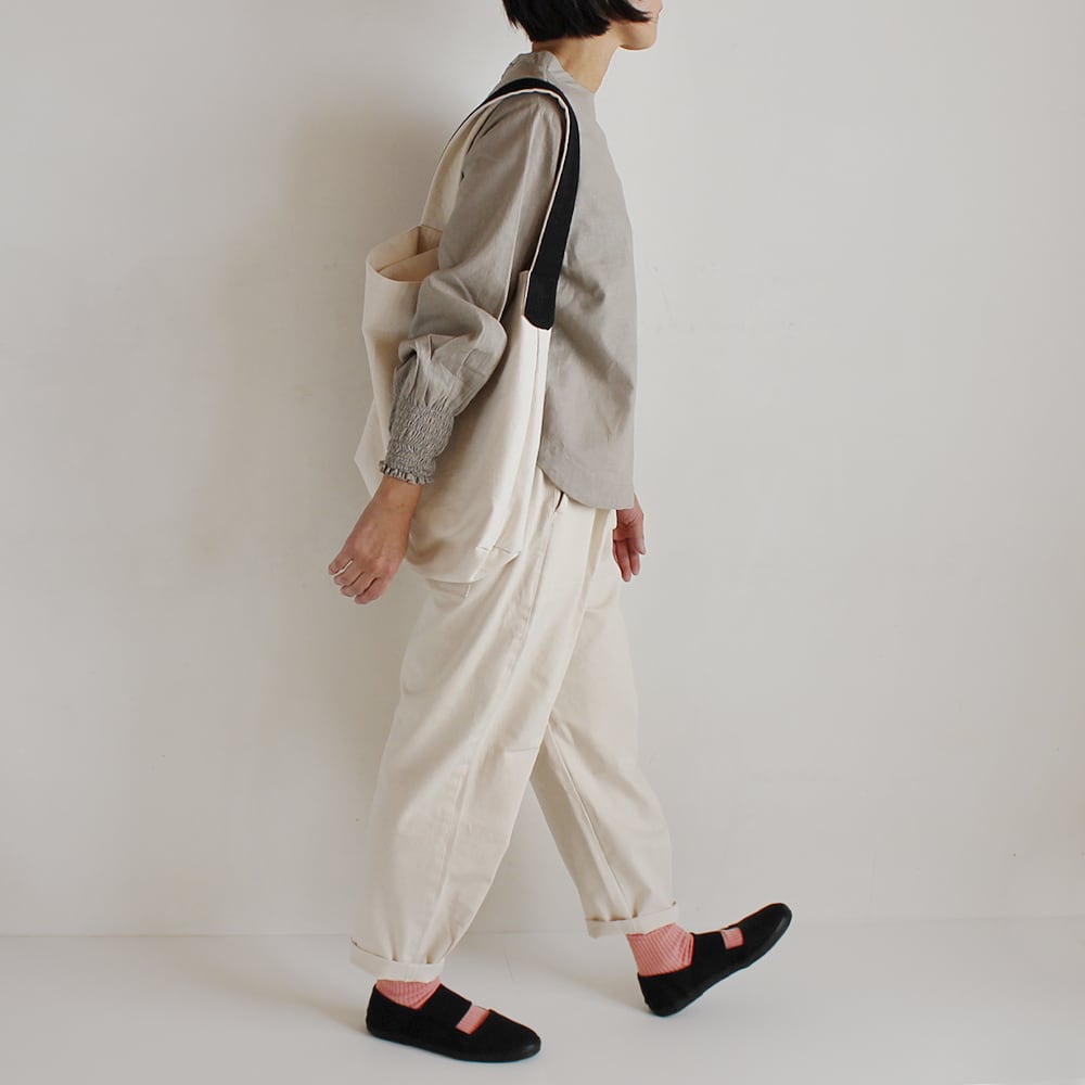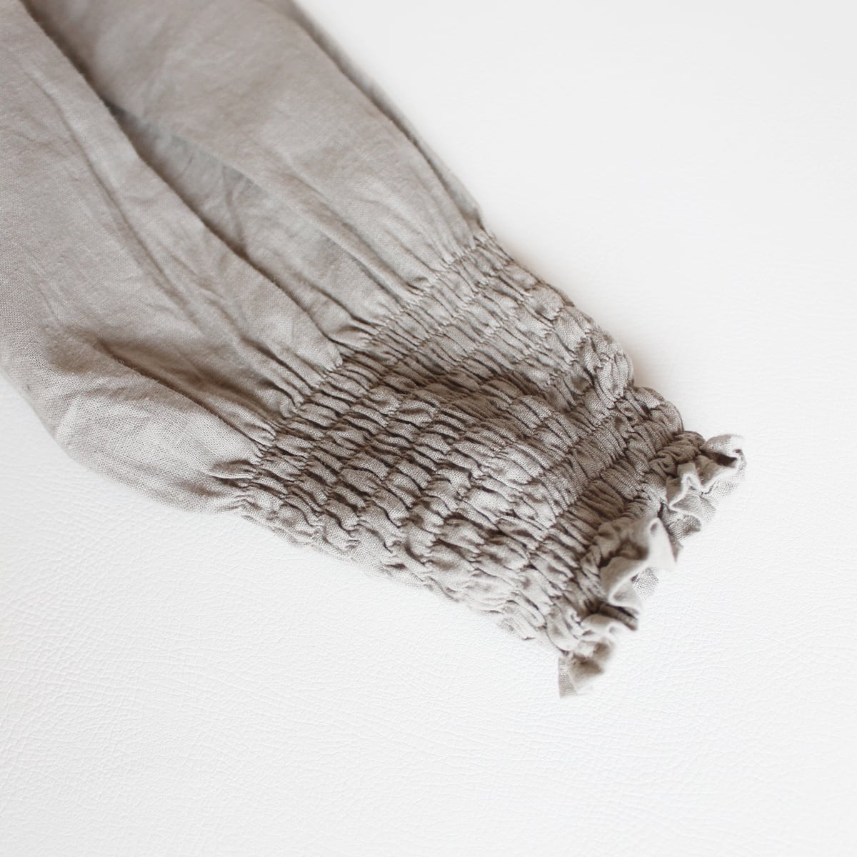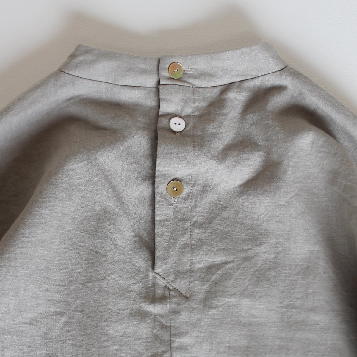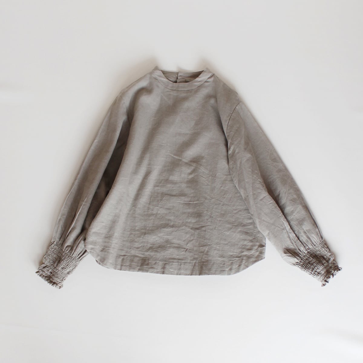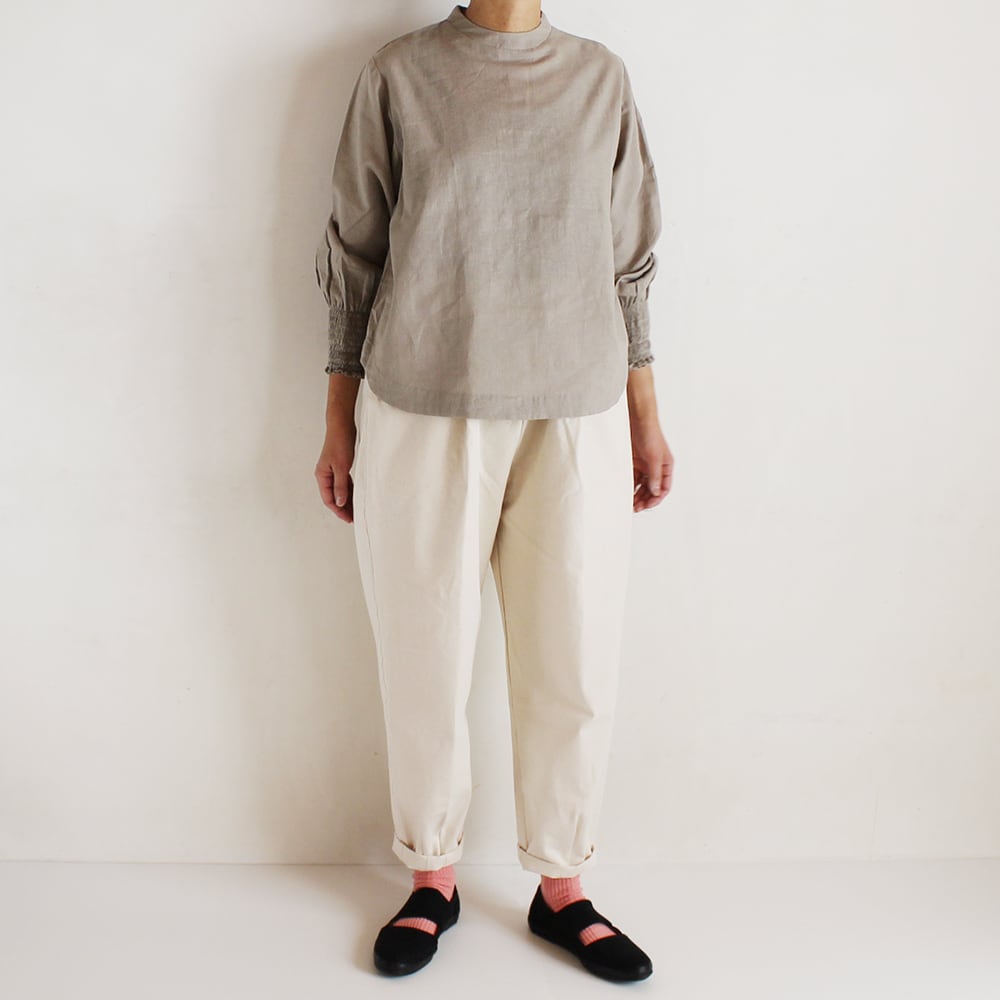 コットンリネンのスタンドカラーブラウスです。袖口にシャーリングをあしらい、優しいフィット感があります。後ろにボタンが3つ付いています。麻が入っているので、生地の風合いが良く、柔らかい印象となります。ボトムを選ばない丈で、着回しが効く一枚です。
